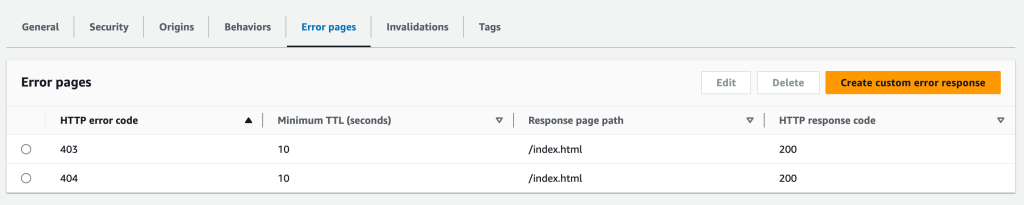After creating my distribution, I can add some behavior for the error pages. What I want is that when the page is not found, it loads the index.html file. But I have to do it using a 200 HTTP response code, otherwise, the browsers or the Search Engines will consider this behavior an error.