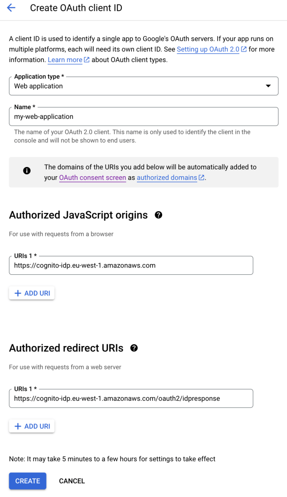 In the authorized origins and redirect URIs, I add the AWS Cognito URL, as my application won’t communicate directly with Google.