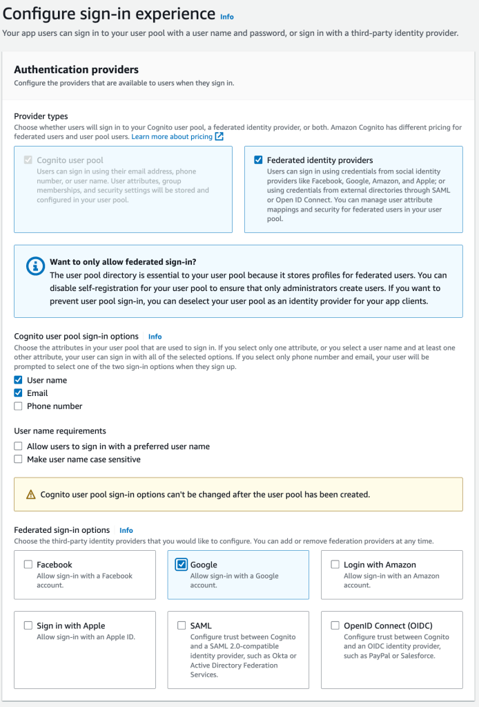 In the first step, I indicate that I want to create a User Pool with a social Sign-In. Then I choose Google.