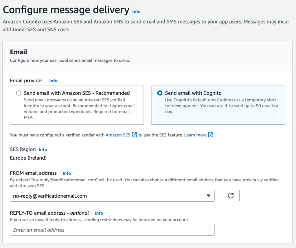 The fourth step is the email configuration to validate an account. For simplicity, I let Cognito manage all the emails.