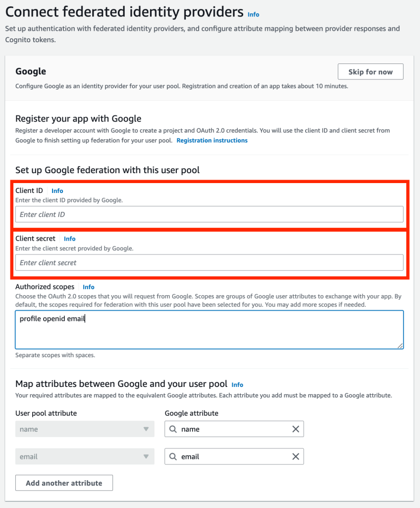 The fifth step is where I connect Google with AWS Cognito. Here I paste the Client Id and Client Secret of Google. Following, I indicate which are the scopes requested: profile, openid and email.